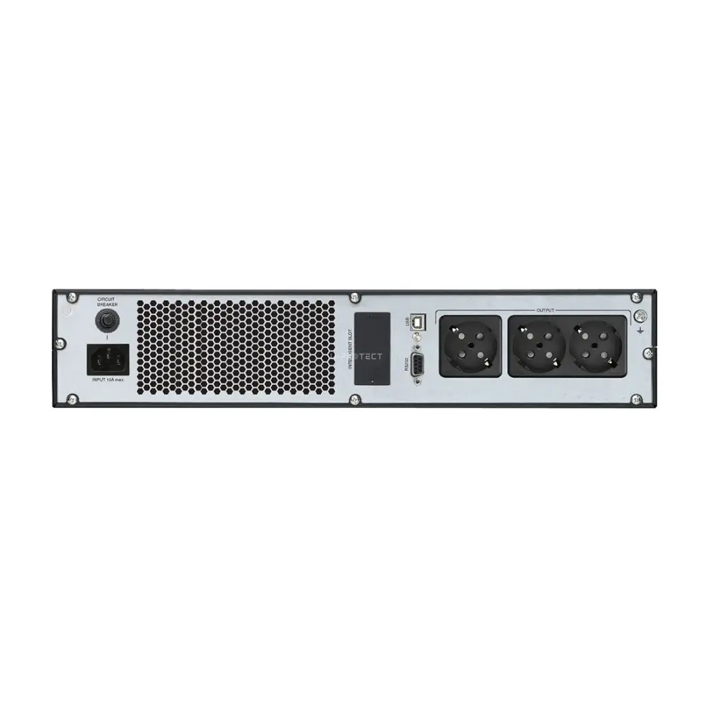 ДБЖ онлайн (подвійного перетворення). Потужність: 1000 ВА / 900 Вт. Вхідна напруга: 162-290В. Вихідна напруга: 208В / 220В / 230В / 240В. Форма вихідної напруги: чиста синусоїда. 2 АКБ 12В ємністю 9Агод. Вихідні роз’єми: 3 Schuko. USB, RS232. Розміри 438 x 310 x 88 мм